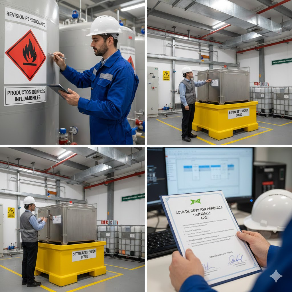 • Verificación de Seguridad: Comprobación del estado de recipientes, sistemas de retención (cubetos), ventilación, distancias de seguridad y señalización.